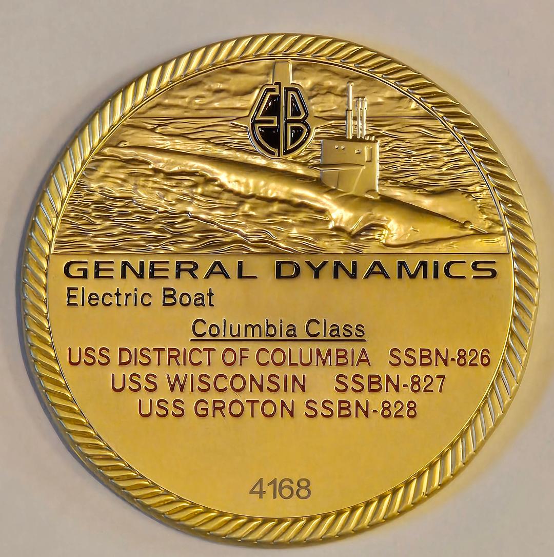 SubMerch offers up this very large round coin. The front has a Columbia boat over a globe/American flag. The back has the Columbia Class boats (as current) consisting of the District of Columbia, Wisconsin and Groton. 3" in diameter. Serial numbers 4,166 and 4,168. Pick your favorite number!